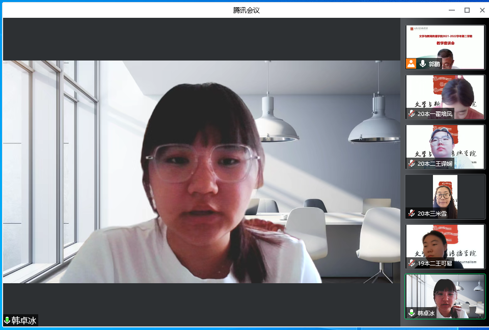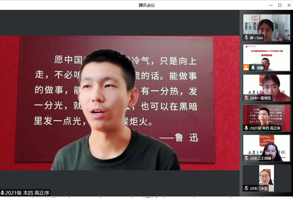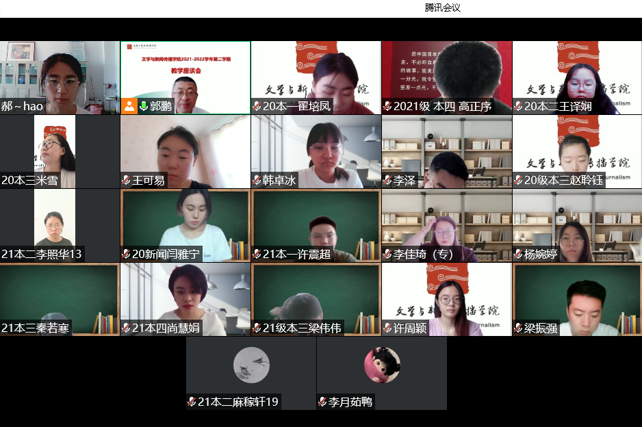 为了进一步做好本学期教学质量监控与评价工作,全面了解我院教学质量及运行现状,切实解决同学们学习中遇到的实际问题,6月23日上午,文学与新闻传播学院采取线上会议的式召开了2021-2022学年第二学期教学座谈会。会议由教学科郝晓宏老师主持,副院长郭鹏及22名学生代表参加了本次座谈会。