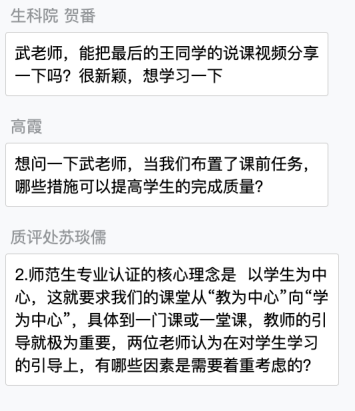 在现场问答环节中,与会人员畅所欲言,积极主动地与两位主讲教师进行交流,特别是围绕师范类专业认证理念下的教学设计进行了卓有成效的深入讨论。