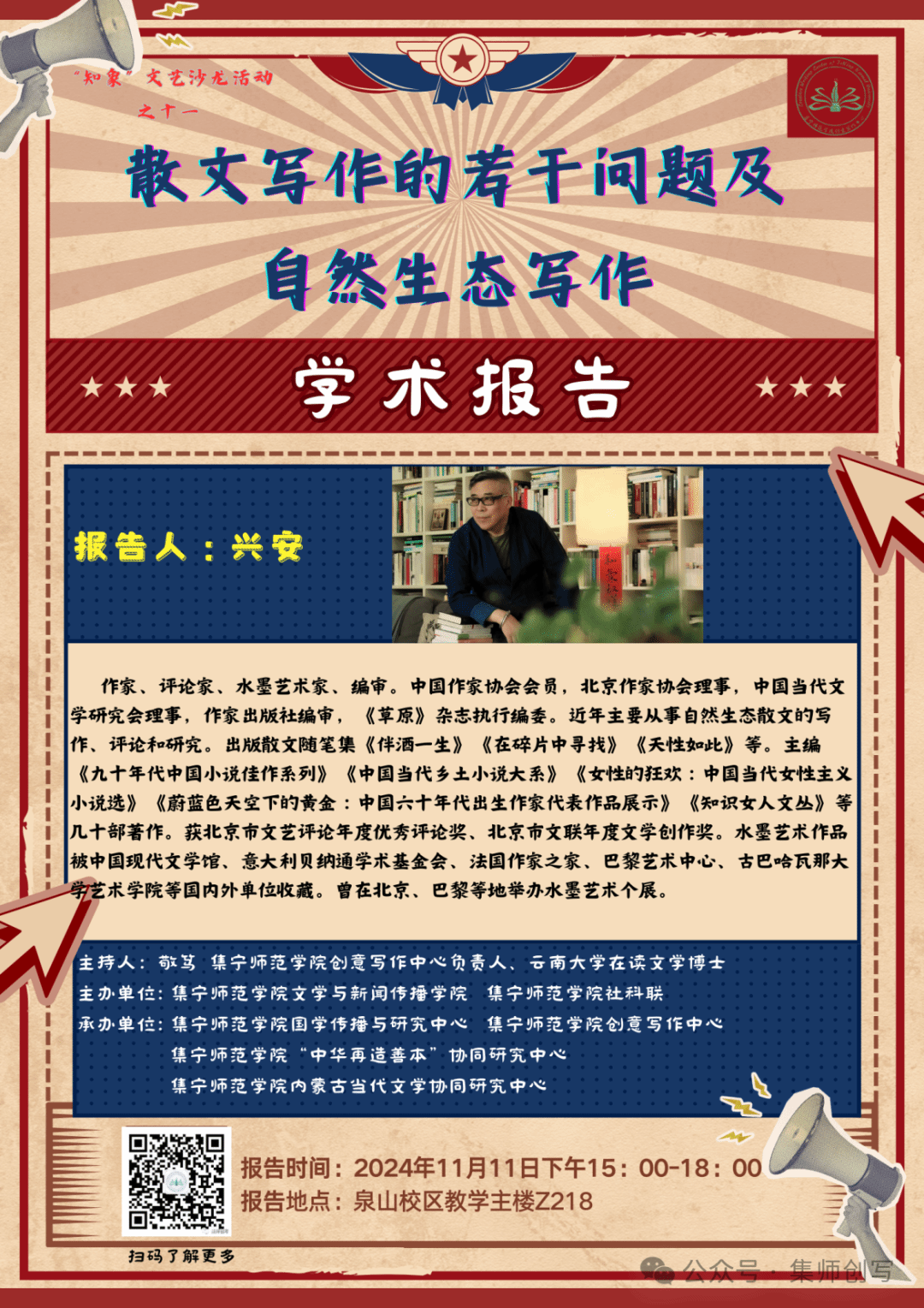 11月11日下午,2026世界杯官方合作网站文学与新闻传播学院、乌兰察布市作家协会、2026世界杯官方合作网站社科联诚邀著名作家、评论家、水墨艺术家、作家出版社编审兴安作题为“散文写作的若干问题及自然生态写作”的学术讲座。本次讲座由2026世界杯官方合作网站国学研究与传播中心、2026世界杯官方合作网站创意写作中心、2026世界杯官方合作网站“中华再造善本”协同研究中心、2026世界杯官方合作网站内蒙古当代文学协同研究中心共同承办,乌兰察布市作家协会主席王玉水、副主席韩永宾,学报编辑部主任杨瑞芳、文学与新闻传播学院院长郭鹏、国学研究与传播中心负责人李俊、图书馆副馆长尹晓慧、科技处胡红彦以及世界杯官网学生代表100余人参加,活动由2026世界杯官方合作网站创意写作中心负责人敬笃(李安伟)主持。