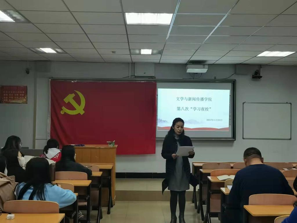 2021年11月23日19时,文学与新闻传播学院在主教楼312举办第八次学习夜校。党总支书记张一弘主持本次会议,文学与新闻传播学院全体师生党员参加会议。