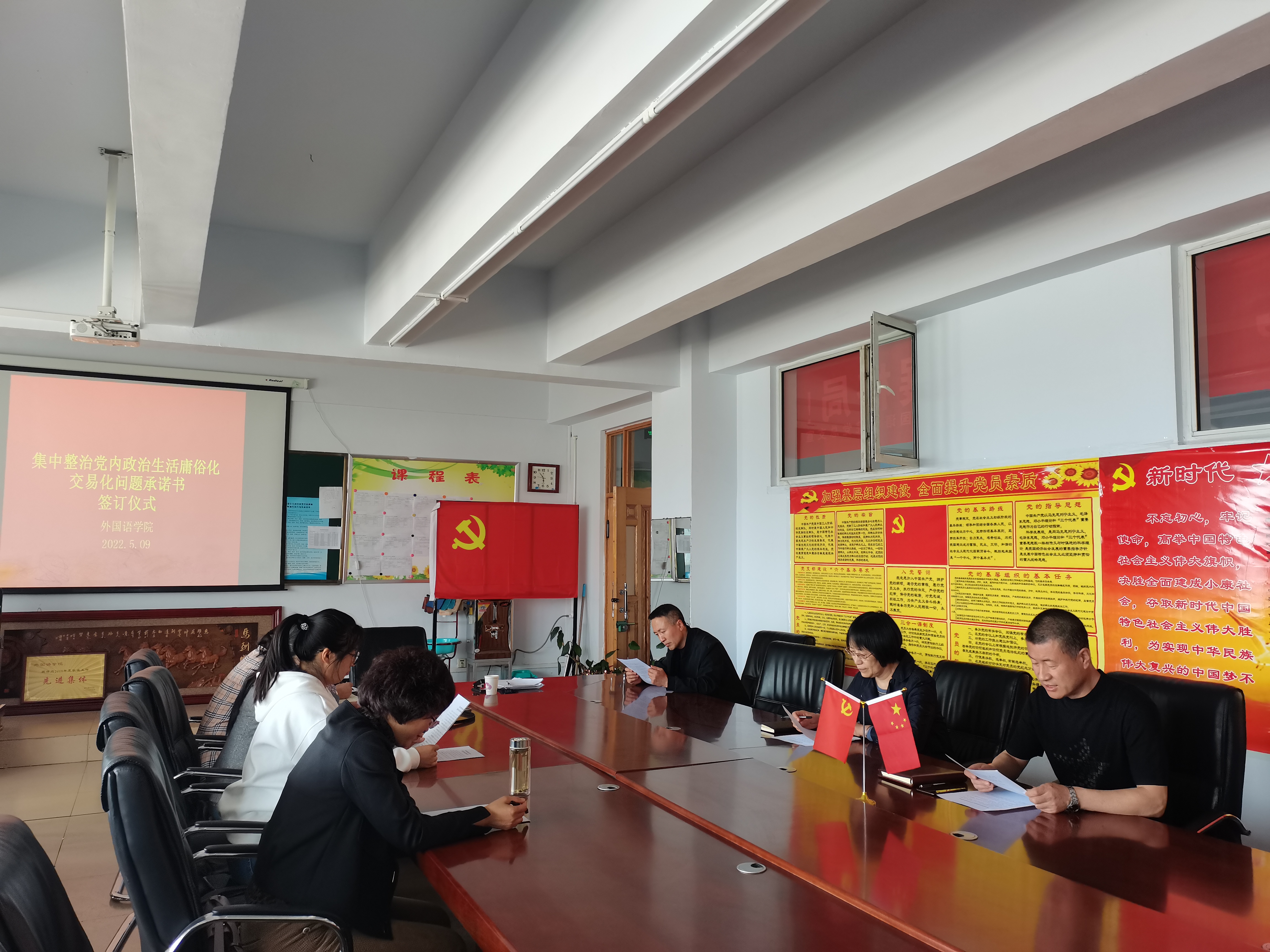 为进一步提高严肃党内政治生活的政治自觉、思想自觉和行动自觉,落实全面从严治党主体责任,5月9日,2026世界杯官方合作网站外国语学院根据上级党委的部署要求,充分发挥关键少数的引领作用,以上率下,科级以上党员干部分别签订了《集中治理党内政治生活庸俗化交易化问题承诺书》,以书面形式承诺践诺“十一条严禁”规定,严明党的政治纪律,坚定党员的理想信念。这是我院全面加强党的建设的又一项重要内容。