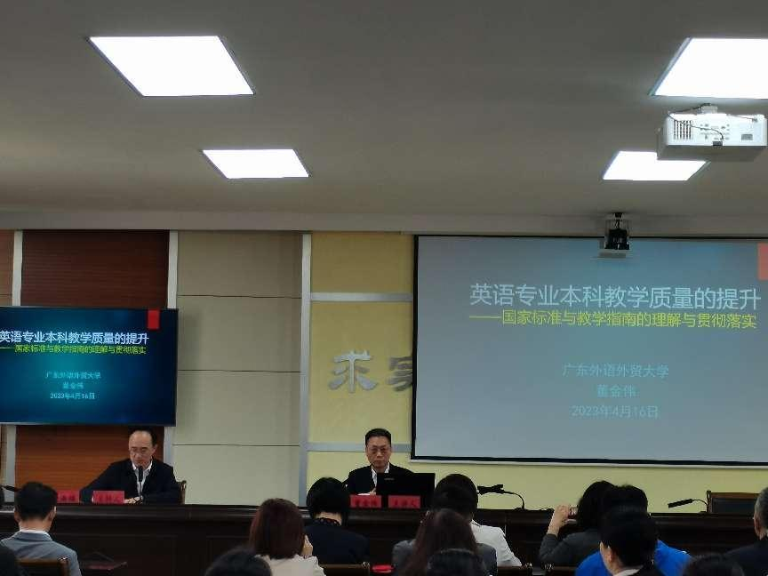 换届选举大会结束后,广东外语外贸大学英语教育学院院长董金伟教授做了题为“高等学校英语专业本科教学质量的提升”的专题讲座,全体与会人员和外国语学院全体教师聆听了专题讲座。讲座从我国高校英语专业普遍存在的“小才拥挤、大才难觅”的现状出发,分析造成这一现状的内外部原因,进而提出走出困境的一些思路,即充分认识英语专业的专业特征,回归其专业属性,按照“国标”和“指南”的精神,合理把握英语专业人才培养定位,充分挖掘学校优质优势教育资源,科学设计英语专业相关方向课程,强化英语专业内涵建设,持续提高英语专业人才培养质量。