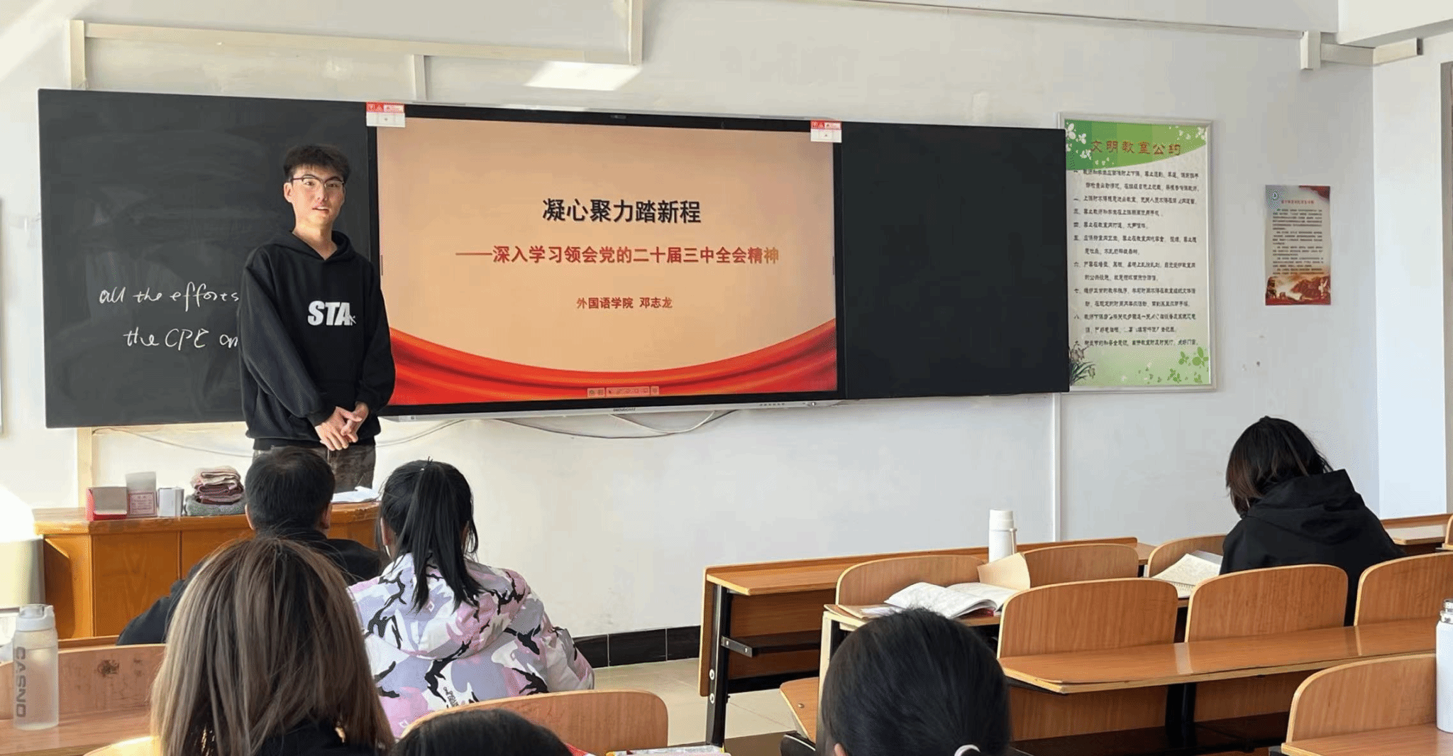 2024年9月25日,宣讲团成员邓志龙为外国语学院2022级英语二班做了题为《凝心聚力踏新程——深入学习领会党的二十届三中全会精神》的宣讲;9月26日,王瑞为2024级新生做了题为《改革新征程,三中全会起新篇》的宣讲;孟琪茗围绕党的二十届三中全会精神为2022级英语一班做了宣讲。