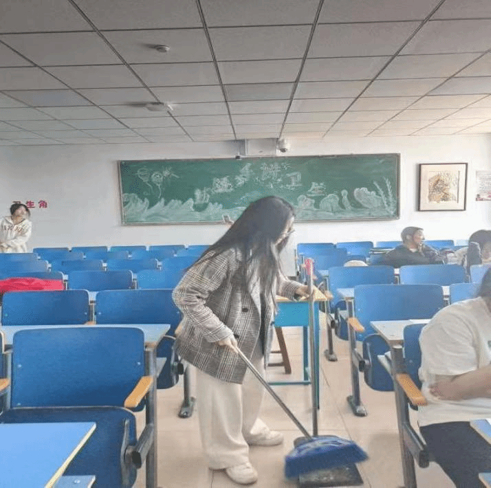 打扫教室的同学们仔细擦拭黑板、窗台,清扫教室角落,让每一间教室都明净整洁。