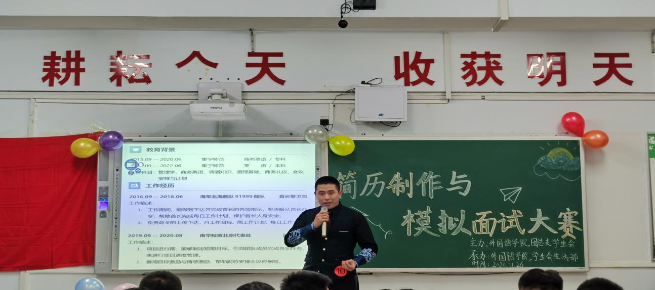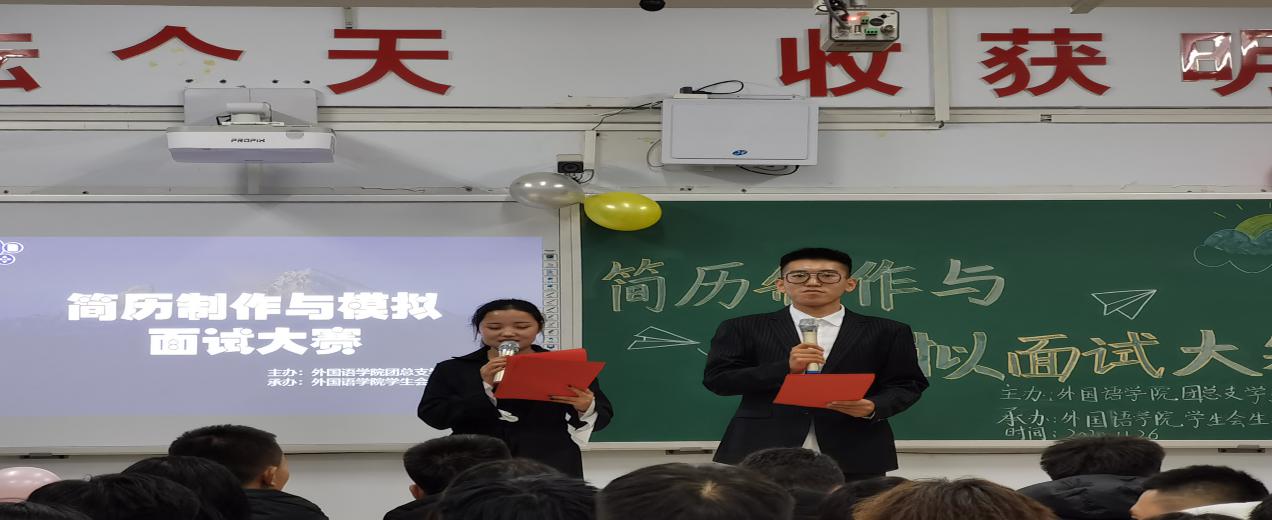 为了增强学生就业意识,促进学院就业工作,外国语学院于11月26日晚在519教室举办了大学生简历制作与模拟面试大赛。