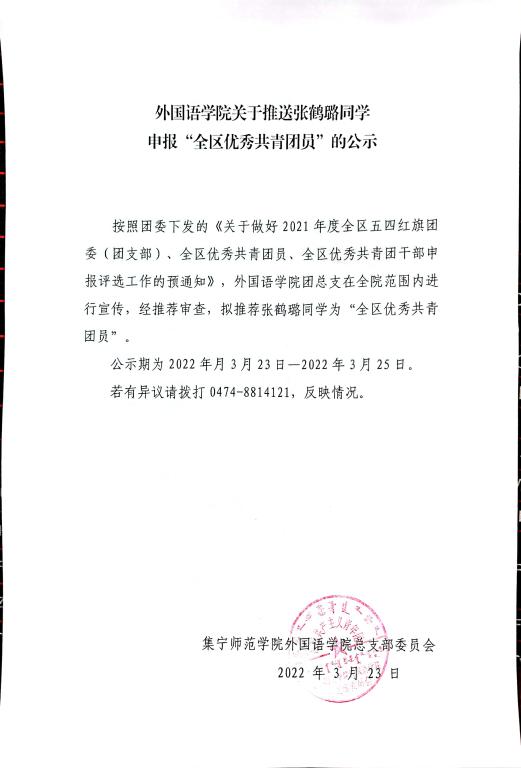 关于推荐“张鹤璐”同学为全区优秀共青团员的公示