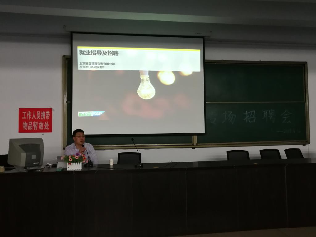 2018年3月14日19:00,在世界杯官网教学主楼z215教室进行了北京安豆管理咨询有限公司就业指导与就业招聘会。外国语学院的毕业生学生参加此次就业指导与就业招聘会。本次招聘会上相关负责人向大家阐述了部分企业的招聘要求和当前的就业形势,并询问学生关于就业方面的想法,期间以Exit的形式向大家展示了企业岗位明细,企业管理方法、任职要求、岗位职责等。主讲老师还向学生们介绍了当前的就业压力,并邀请同学们上台进行模拟自我介绍等面试过程。