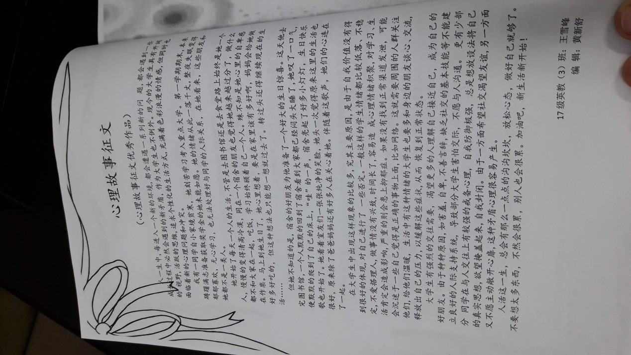 为了增强大学生心理健康意识,提高大学生心理健康水平,宣传心理健康知识。根据学校《关于开展第八届“大学生心理健康教育宣传月系列活动”的通知》要求,按照学校心理健康教育中心的总体安排,我院在2018年5月5日至5月15日,顺利开展了“外国语学院大学生心理故事征文大赛”。大赛由外国语学院学生会编辑部承办,针对我院英语专业、英语教育及商务英语专业的在校生,参赛选手在规定的时间以个人名义完成征文稿,并交由了学生会编辑部进行参评,作品内容都以心理健康故事为主,重点突出,详略得当。经过评审,一等奖由17级英语教育二班曹乐获得,二等奖获得者为17级英语一班黄新舒,17级英语一班战智慧。获奖作品刊登在外国语学院院报心理健康专栏。