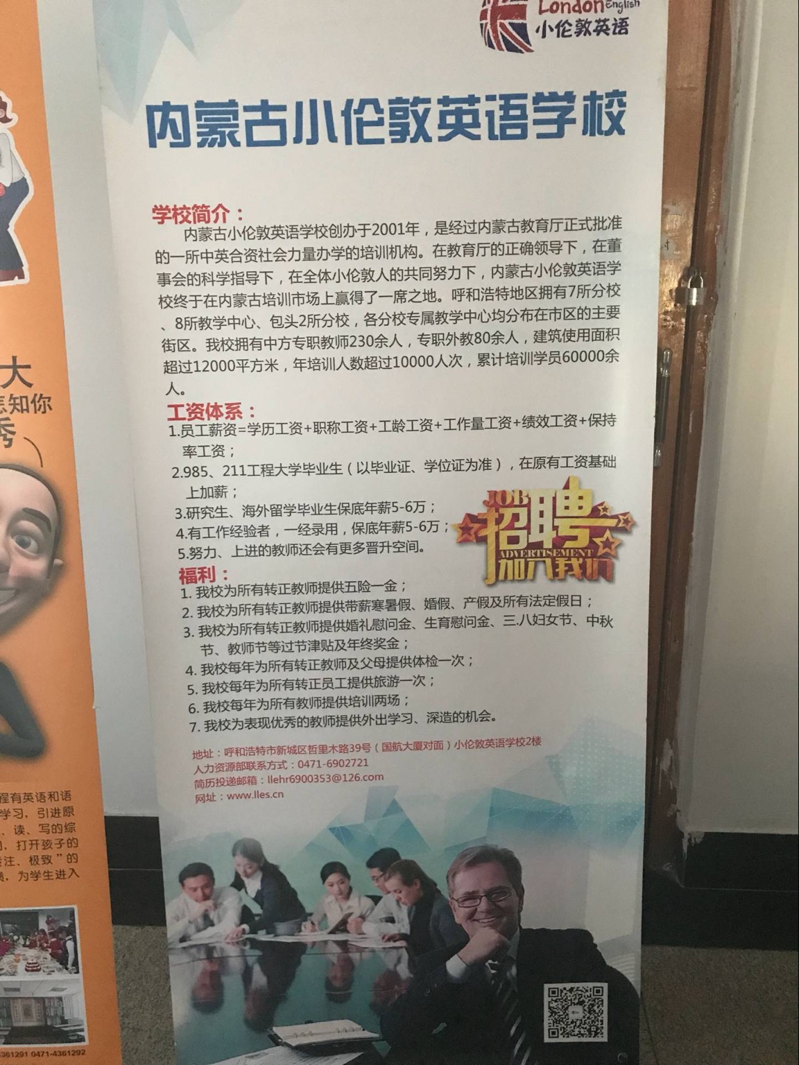 2017年11月30日下午三点内蒙古小伦敦英语学校招聘会在主教楼519举行,此次招聘活动主要面向我系即将毕业的英语专业大三、大四学生。