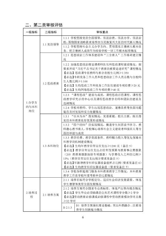 2.第二类审核评估针对高校的办学定位和办学历史不同,具体分为三种:一是适用于已参加过上轮审核评估,重点以学术型人才培养为主要方向的普通本科高校;二是适用于已参加过上轮审核评估,重点以应用型人才培养为主要方向的普通本科高校;三是适用于已通过合格评估5年以上,首次参加审核评估、本科办学历史较短的地方应用型普通本科高校。第二类审核评估重点考察高校本科人才培养目标定位、资源条件、培养过程、学生发展、教学成效等。
