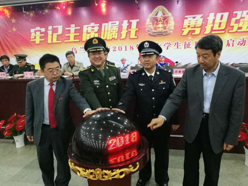 乌兰察布军分区郭杰司令员宣布大学生征兵工作正式启动。郭杰、洪赪颢、李琮、刘前贵四人共同按下启动仪式按钮。