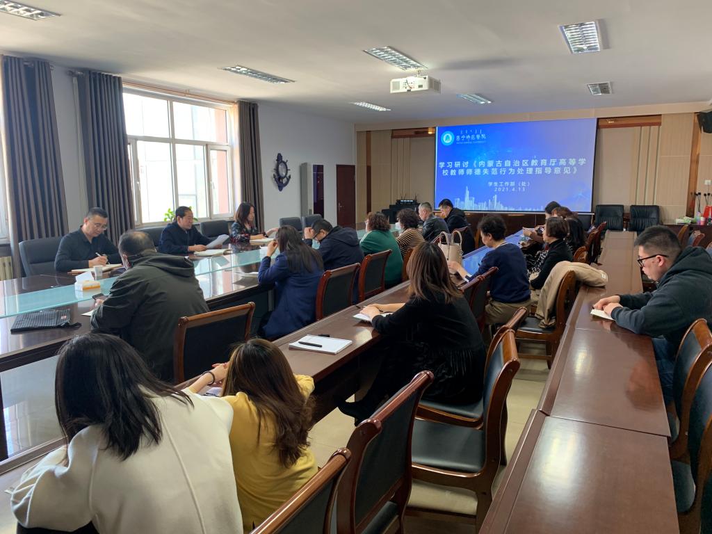 第一环节学习研讨《内蒙古自治区教育厅高等学校教师师德失范行为处理指导意见》,部门全体教职工参加学习研讨。学生工作部部长兰立新传达《内蒙古自治区教育厅高等学校教师师德失范行为处理指导意见》文件精神,副部长王飞领学《内蒙古自治区高等学校教师师德失范行为负面清单》。