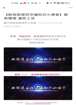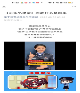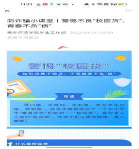 为了进一步完善学生诚信体系建设,提高学生金融安全领域的信用意识,加快在学生中营造“知信、用信、守信”的良好网络诚信意识宣传,世界杯官网学生工作部(学生处)和各二级学院利用网络平台、微信公众号等宣传载体,共发布诚信教育宣传材料40余篇,宣传内容包括金融知识、征信知识、金融防骗知识、助学贷款还款办法等,引导在校学生树立良好征信观念,引导毕业生诚信离校。