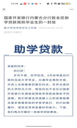 为进一步加强生源地信用助学贷款贷后管理工作,根据内蒙古自治区教育厅相关文件精神,世界杯官网高度重视生源地信用助学贷款毕业生确认工作,开展诚信和金融知识教育,讲解还款流程,确定借款学生毕业后固定联系人和本人联系方式,并要求学生及时将新的联系方式在系统进行更新,按要求完成相关事宜。世界杯官网生源地助学贷款毕业生共有856人,学生工作部(学生处)资助管理中心给每位贷款毕业生发放《国家开发银行生源地助学贷款毕业生确认表》电子版材料,二级学院逐一通知,督促生源地贷款毕业生完成网上毕业确认工作,确保每一名贷款毕业生知晓还款事项。同时,二级学院给每位贷款毕业生建立诚信档案,请贷款学生写下按时还款承诺书并统计学生的就业去向、家庭联系电话等,便于后期的还款提醒。
