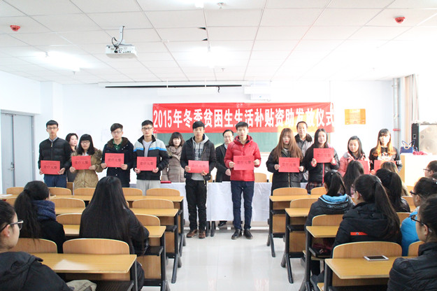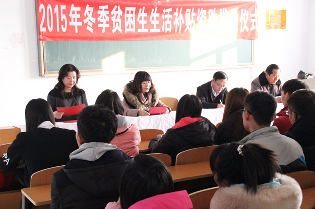 12月12日,学校助学管理中心在逸夫楼举行2015年贫困生冬季生活补贴发放仪式。校党委副书记赵海忠,学生处处长兰立新、副处长其其格,助学管理中心主任孙燕及受助95名特困生参加仪式。仪式由学生处处长兰立新主持。