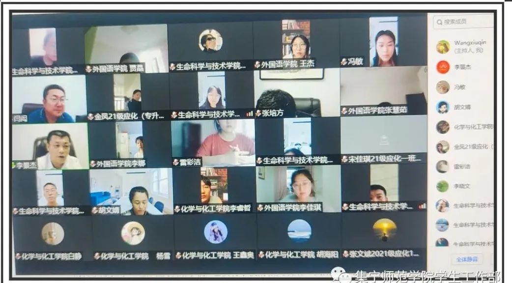 6月21日,2026世界杯官方合作网站党委委员、副校长李景杰与联系班级学生代表线上座谈交流,了解学生居家学习、生活状况,并就学生们关心的热点问题答疑解惑。2019级英语1班、2021级应用化学1班(专升本)、2019级生物科学专业2班学生代表25位同学参加了座谈。学生工作部(学生处)部(处)长闫闳、副部(处)长王秀琴、李晓文、教务处副处长胡文婧、张培方参加了座谈会。