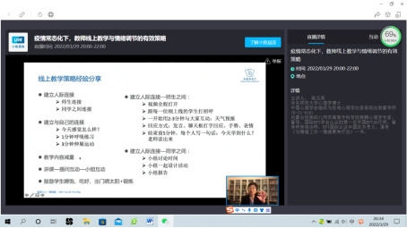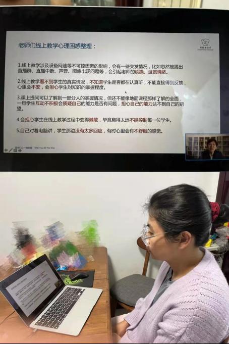 本期讲座由华东师范大学心理学院心理学博士陈玉英主讲,她通过梳理出教师在线上教学过程中存在的若干情绪问题以及线上教学的弊端对学生学习状态的影响,建议教师在开展线上教学前要引导学生学会自我觉察,通过活动了解和识别自身情绪、进行正念训练,在教学过程中要以学生为本、重视学生需求,加强师生之间和同学之间互动,多种形式提高教学效果,帮助学生克服孤独感,缓解情绪压力,以良好的状态投入到学习之中。