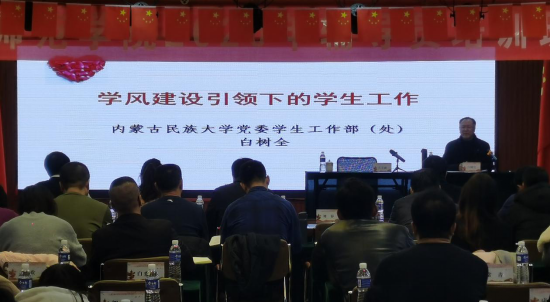 第三场由内蒙古民族大学党委学生工作部部长白树全以“学风建设引领下的学生工作”为题作专题讲座。白树全结合本人丰富的学生工作经验以及内蒙古民族大学学生工作的经典做法和创新举措,围绕学工人员应注重培养的学生核心素养、如何建设良好的学风、如何处理学习障碍等问题,以大量生动的案例为依据,作了全面周详的介绍和分享。