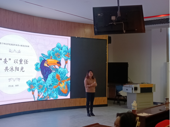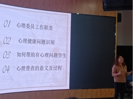 心理健康教育专职教师钟华以“委以重任,共沐阳光”为题,从心理委员工作职责、心理健康问题识别、如何帮助心理问题学生、心理普查的意义及过程等四方面,帮助同学们进一步明确了自己的职责,实现了对心理委员的职责认同,增强了责任感,掌握了帮助他人的基本知识和技能,同时对近期心理普查工作中各班级出现的问题进行了解答。