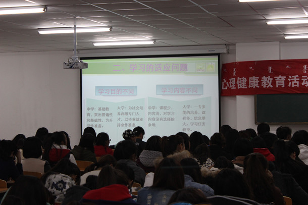 10月11日下午,大学生心理健康知识讲座在白海校区举办。心理健康知识讲座是世界杯官网大学生心理健康教育系列活动之一和入学教育重要一环,世界杯官网心理健康教育与咨询中心邀请思政教学部晓荣老师作了题为《关于适应大学生活 确立新的目标》的讲座。白海校区2014级新生共300余人聆听了讲座。