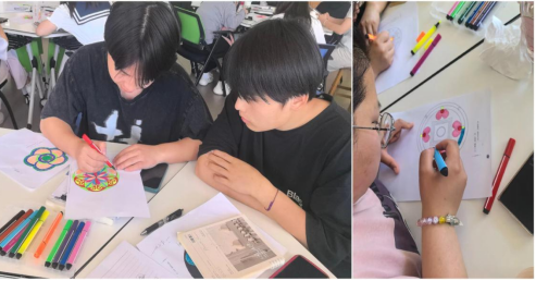 本次彩绘曼陀罗活动在李荣老师的引导下,学生认真参与,深入自己的潜意识世界,进行自我探索和情绪探知。每幅曼陀罗画都各具特色,诉说着不同的故事。每一幅画都像一把钥匙,打开了真实自我的心门。通过分享和讨论,学生们得以释放情绪,陶冶心灵,激活内在能量。在合作与交流中体会着差异与融合,感受到团结的意义与力量。