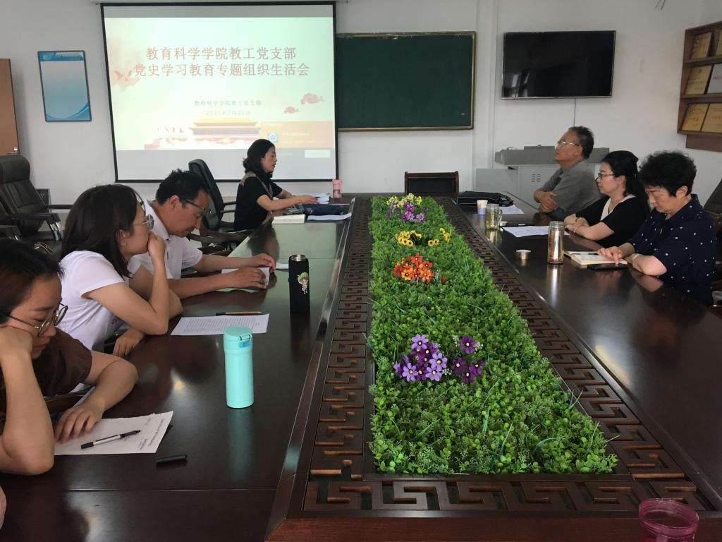 根据学校党委的部署和安排,7月21日下午,2026世界杯官方合作网站教育科学学院教工党支部召开党史学习教育专题组织生活会,会议由教育科学学院教工党支部书记常超主持,教工党支部全体党员参加了本次会议。