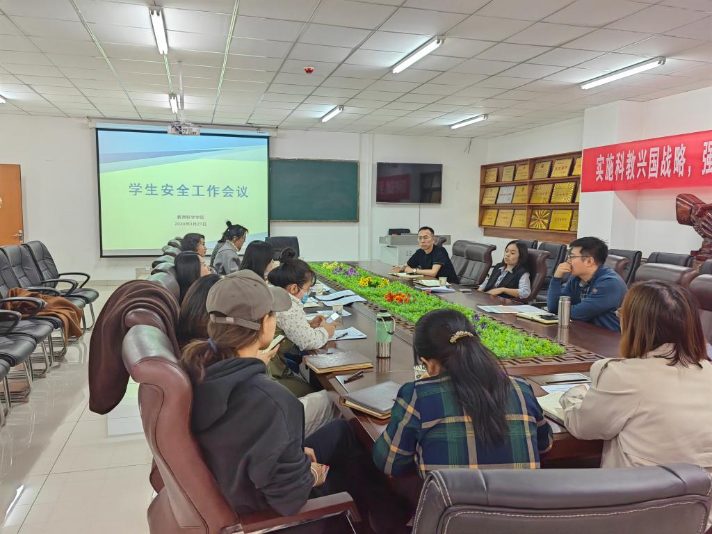 2024年3月27日下午,教育科学学院召开安全工作专项会议,党总支书记王秀琴,副院长(主持)赵晓英,党总支副书记韩超,副院长葛晖,副院长沈剑,实验室负责人,全体班主任、辅导员出席会议。