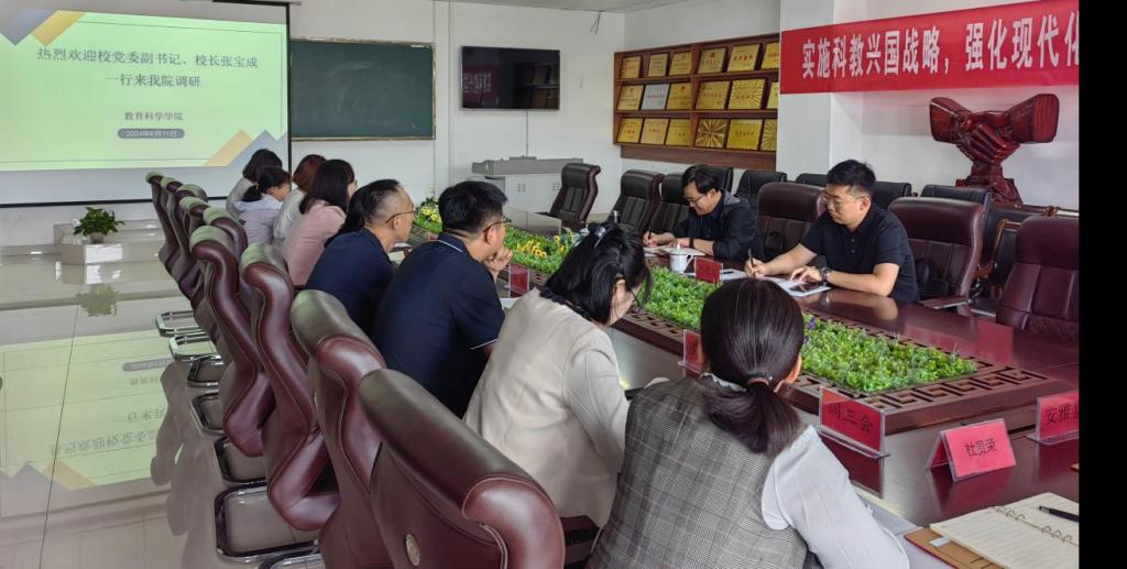 6月11日上午,世界杯官网党委副书记、校长张宝成深入教育科学学院调研座谈。党政办公室副主任杨晓宇陪同。教育科学学院班子成员、科级干部、各教研室负责人参加座谈会。