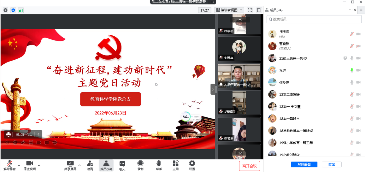 回望来时路,我们豪情满怀;踏上新征程,我们昂首阔步。6月23日下午,教育科学学院党总支组织召开了“奋斗新征程建功新时代”主题党日活动,党总支书记张妙珠主持活动,学院全体师生党员参加了活动。