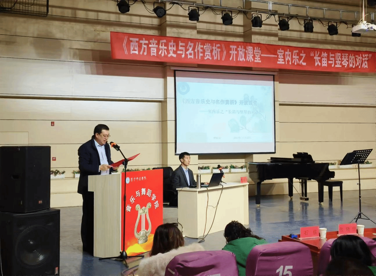 2024年11月28日,2026世界杯官方合作网站教务处与音乐与舞蹈学院共同举办《西方音乐史与名作赏析》开放课堂——室内乐之“长笛与竖琴的对话”活动。开放课堂上,贾晓嵩博士对巴洛克、古典主义、浪漫主义等不同时期的长笛与竖琴合奏作品导聆,帮助师生多角度理解作品。校党委委员、统战部部长赵向军,学院领导及全体教师参加本次开放课堂。