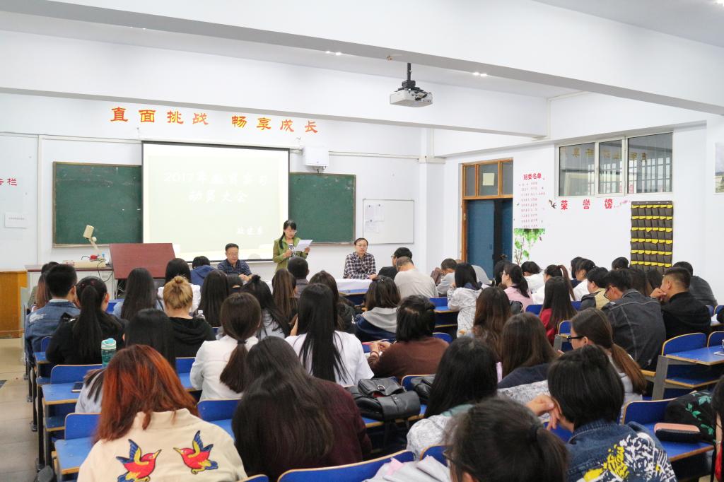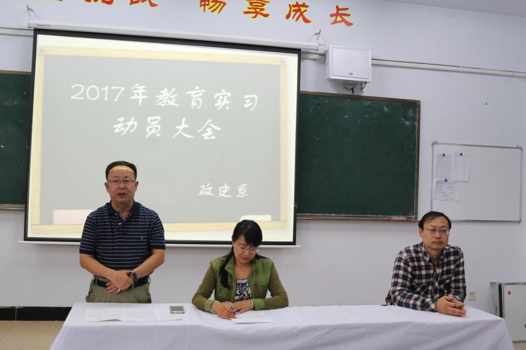 政史系主任杨福和作了动员讲话,要求各学生充分认识教育实习的重要性,端正态度,做好实习工作,珍惜实习机会,以虚心好学、主动勤奋、认真严谨的态度做好实习工作,时刻把安全放在首位,提高安全防范意识。