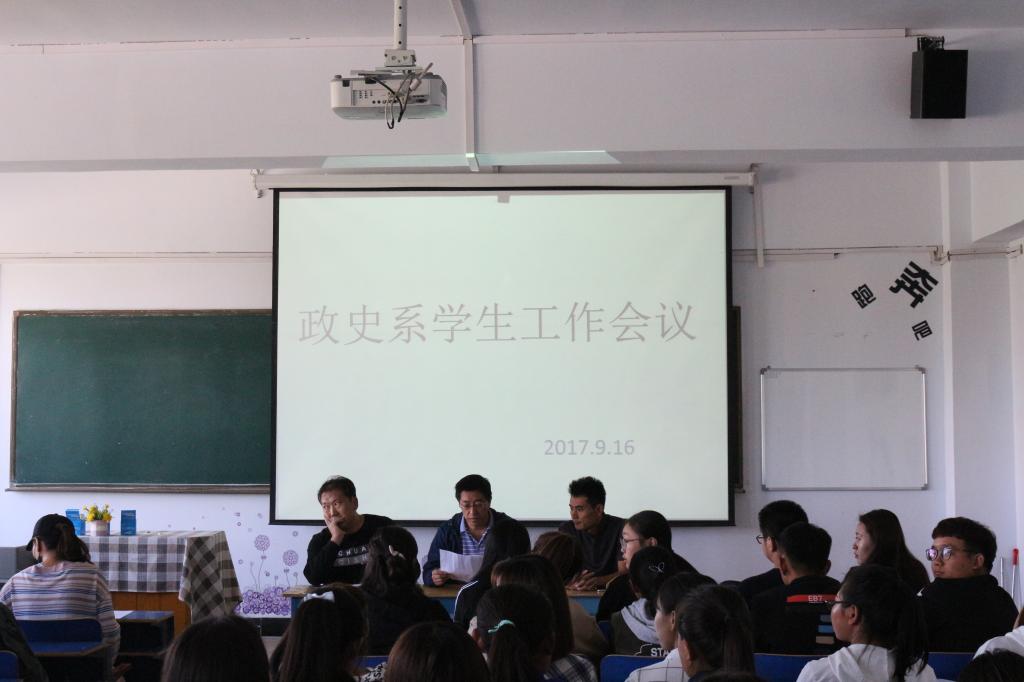 2017年9月16日上午,政史系于主教楼召开团学干部大会,党总支副书记武勇,团总支书记辛飞,学工办主任田博出席会议并做重要讲话,政史系团学全体成员参加会议。