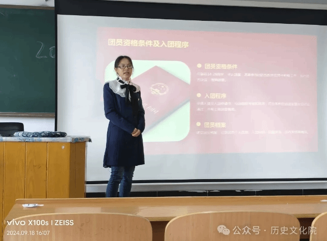 2024年9月18日下午,历史文化学院于主教楼 420 举办了“党团建设”入学教育专题讲座,由学工办主任范丽敏老师主讲。她在讲座上极为详细地为同学们阐述了团员入团的整套流程。从最开始的入团申请,到后续的资格审核、入团仪式等各个方面,她都进行了全面的梳理。