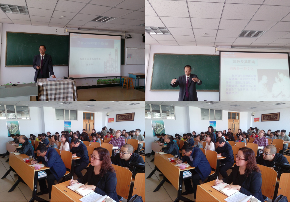 4月26日下午,政法与历史文化学院举行专题学习,由我院池小平教授作了题为“正确认识和对待宗教问题”的专题讲座。讲座由院党总支书记兰林世主持。学院全体教师、学生党员、各教学班团支部书记近80人参加了学习。
