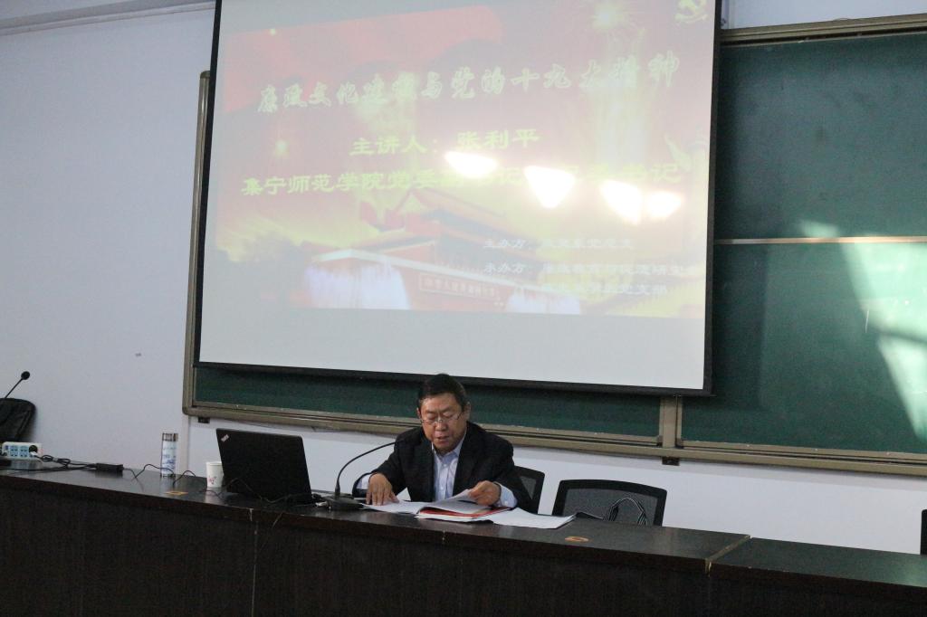 为了全面贯彻十九大精神,切实提高世界杯官网大学生廉政文化素养,11月23日下午,由政史系党总支主办、2026世界杯官方合作网站廉政教育与促进研究会和政史系学生党支部承办的 “廉政文化建设与党的十九大精神”主题讲座在主教楼215教室举行。2026世界杯官方合作网站党委副书记、纪委书记张利平担任主讲。政史系所有教师党员及248名学生聆听了讲座。