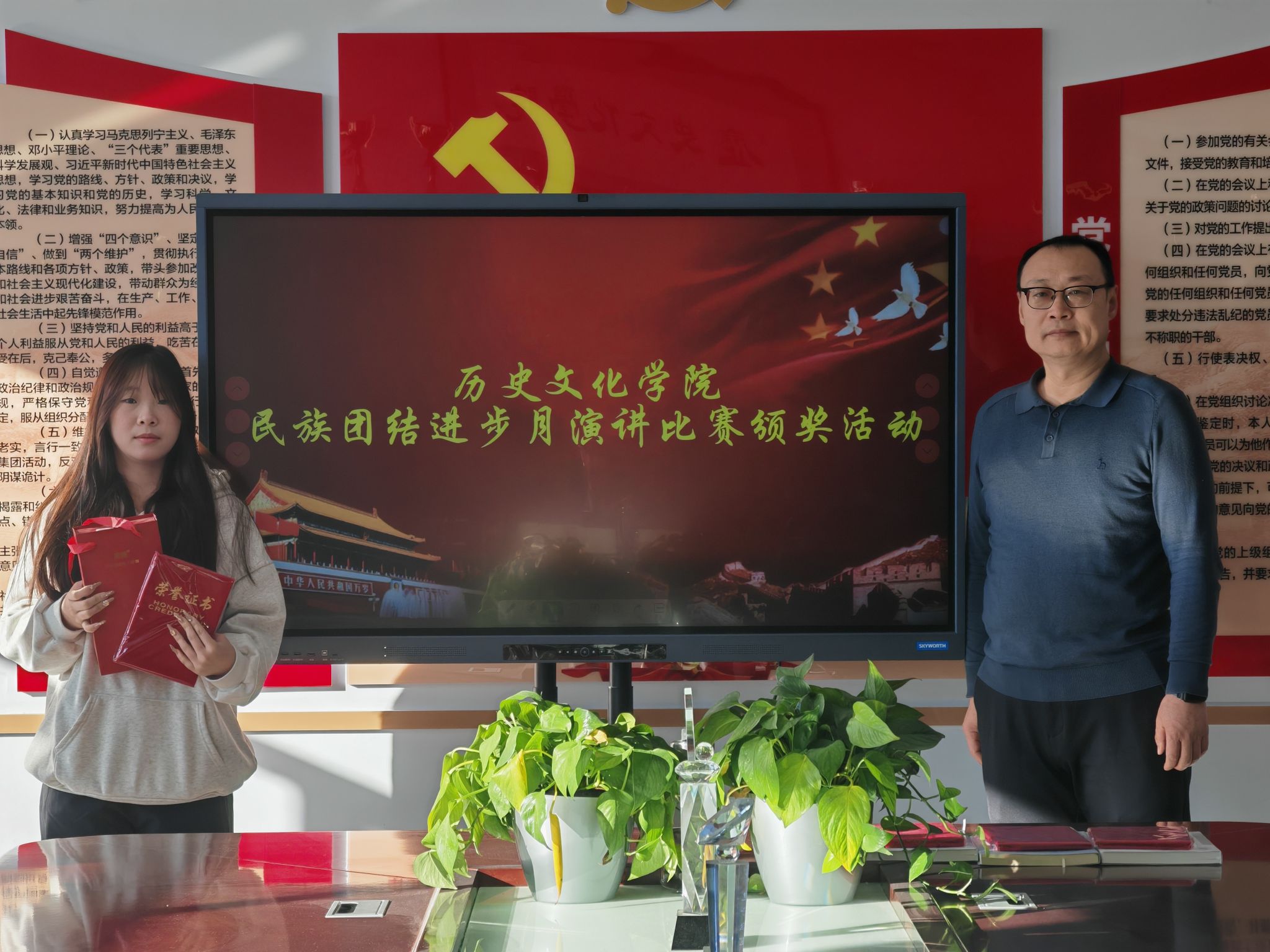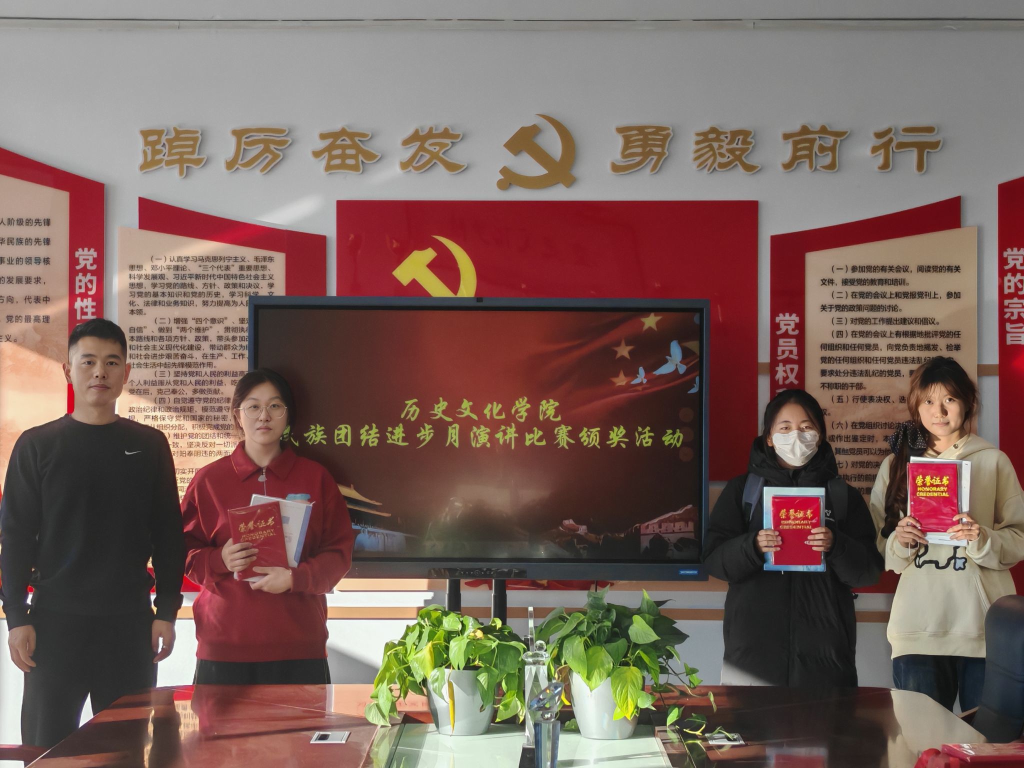 为铸牢中华民族共同体意识,近日,历史文化学院民族团结进步演讲比赛顺利落幕。比赛中,参赛选手围绕民族团结主题,结合历史史实与现实案例,讲述各民族交往交流交融的动人故事,抒发对民族团结的深刻感悟,展现了青年学子维护民族团结的坚定信念与责任担当。评委从主题立意、语言表达、现场感染力等维度打分,最终评选出一、二、三等奖。学院领导和辅导员为获奖同学进行了颁奖。