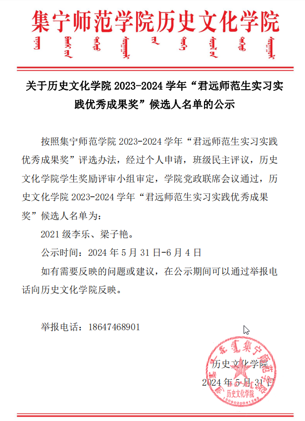 历史文化学院 2023-2024 学年“君远师范生实习实 践优秀成果奖”候选人名单的公示