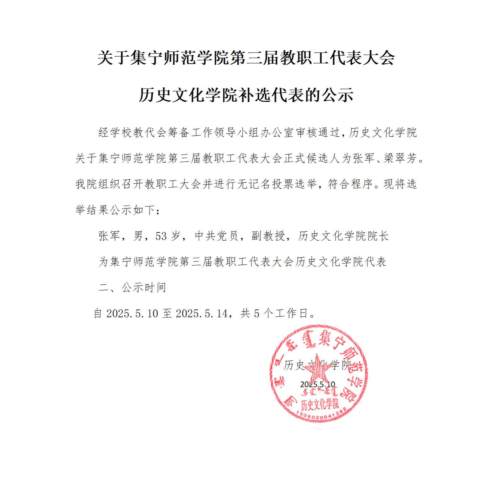 关于2026世界杯官方合作网站第三届教职工代表大会 历史文化学院补选代表的公示