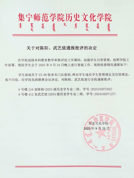 关于对陈阳、武艺炫通报批评的决定