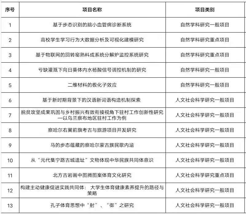 根据内蒙古自治区教育厅发布的《关于做好2022年度自治区高校科研项目申报工作的通知》精神,学校组织学术委员会专家对年龄在40周岁(不含)以上教师申报的16个项目进行了评审,同意“基于步态识别的脑小血管病诊断系统”等13个项目推荐申报内蒙古自治区高校项目,现予公示。