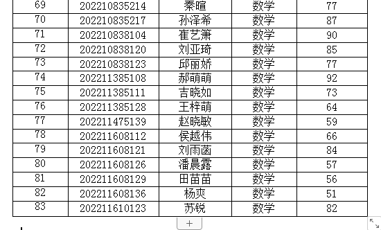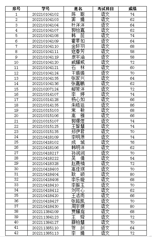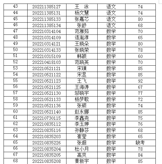现将2023年9月13日参加2022级转入汉语言文学专业和数学与应用数学专业学生的语文和数学考试成绩公示如下: