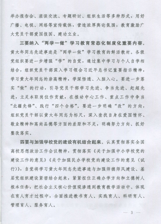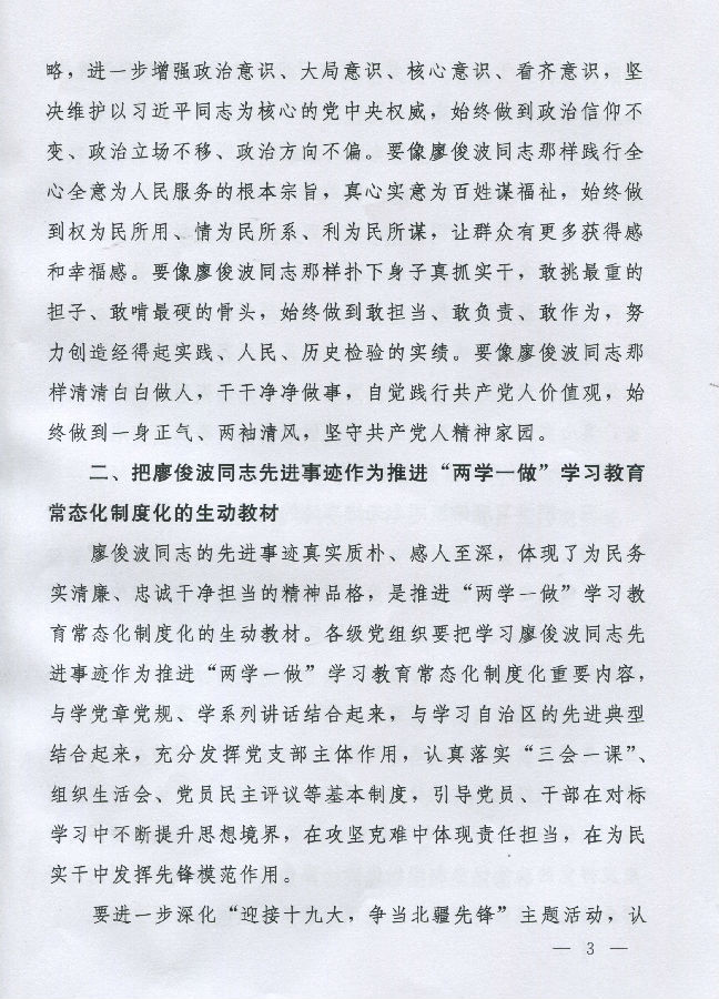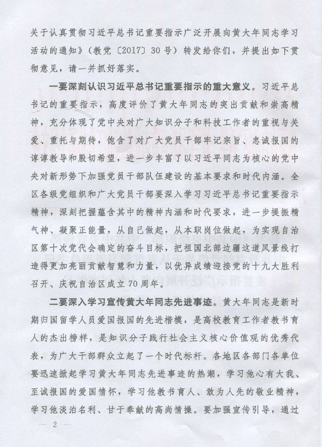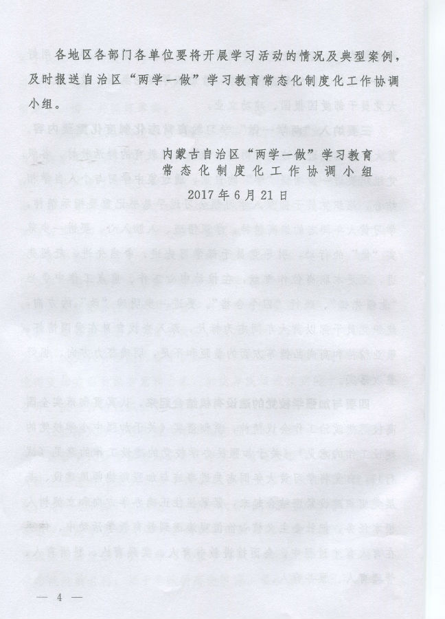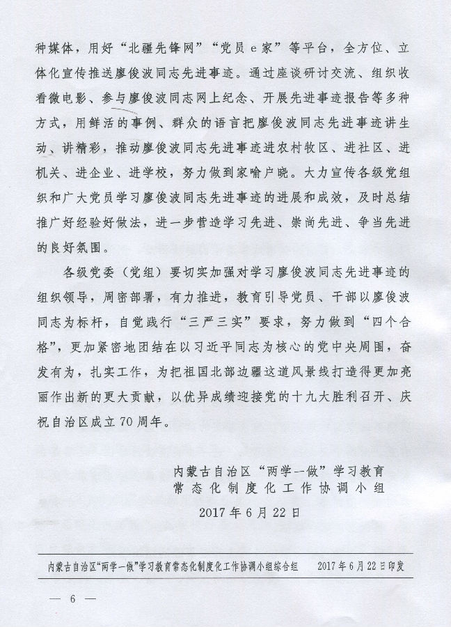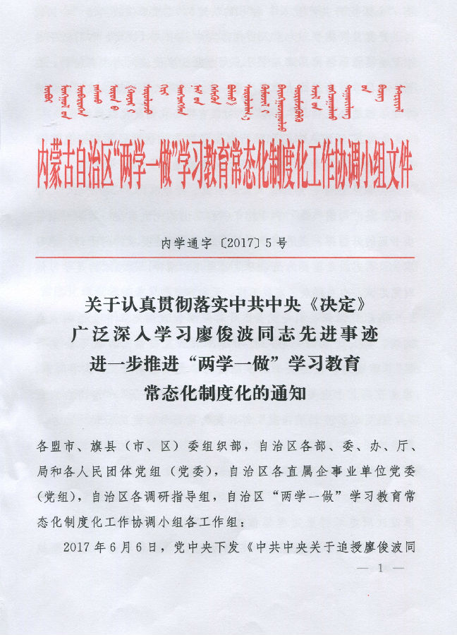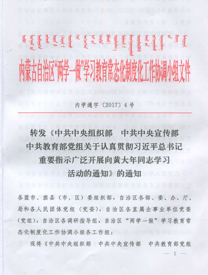 现将内蒙古自治区“两学一做”学习教育常态化制度化工作协调小组转发《中共中央组织部 中共中央宣传部 中共教育部党组关于认真贯彻习近平总书记重要指示广泛开展向黄大年同志学习活动的通知》(内学通字〔2017〕4号)和《关于认真贯彻中共中央决定广泛深入学习廖俊波同志先进事迹进一步推进“两学一做”学习教育常态化制度化的通知》(内学通字〔2017〕5号)转发给你们,请认真抓好学习传达工作。