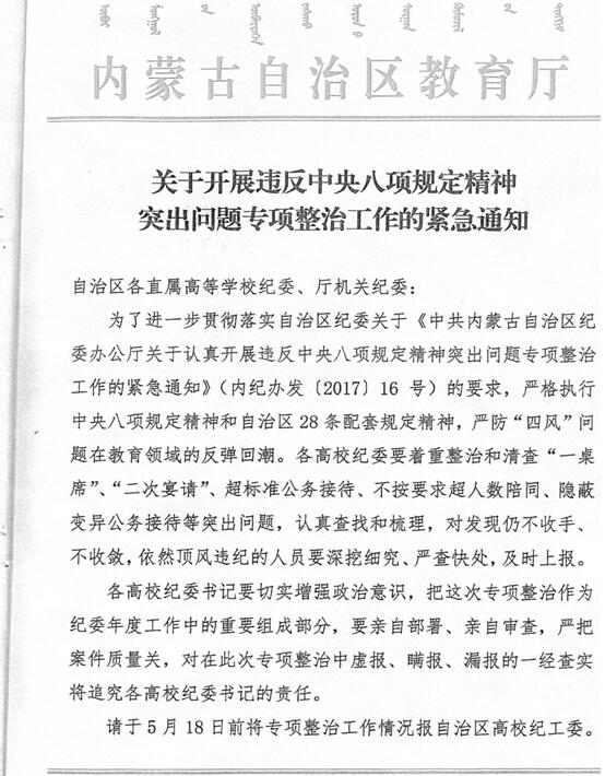 附件:内蒙古自治区高校纪工委《关于开展违反中央八项规定精神突出问题专项整治工作的紧急通知》(内纪办发[2017]16号)