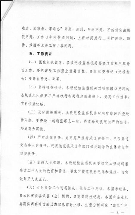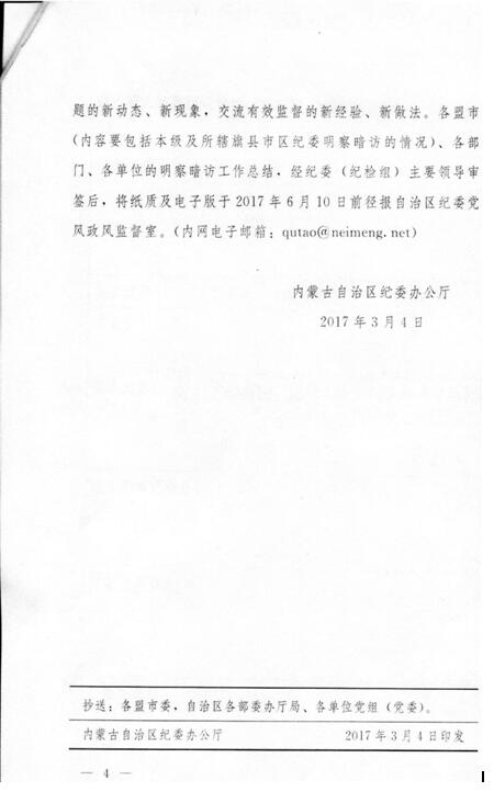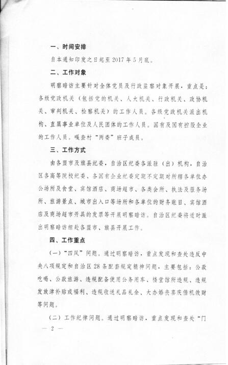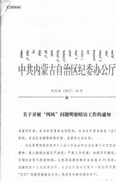 2017年3月4日,自治区纪委办公厅下发了《关于开展“四风”问题明察暗访工作的通知》(内纪办〔2017〕18号,该文件后附)决定在5月底前集中开展“四风”问题明察暗访工作。自治区高校纪工委于3月8日再次发文要求各高等院校纪委要认真执行、加紧落实。