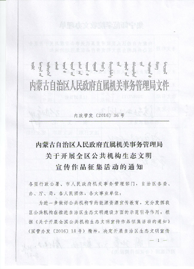 1、《内蒙古自治区人民政府直属机关事务管理局关于开展全区公共机构生态文明宣传作品征集活动的通知》