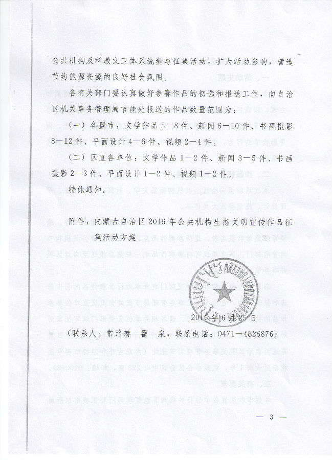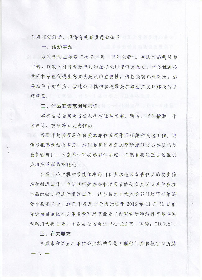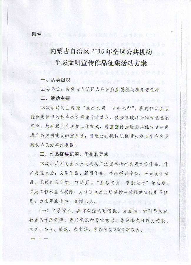 2、《内蒙古自治区2016年全区公共机构生态文明宣传作品征集活动方案》