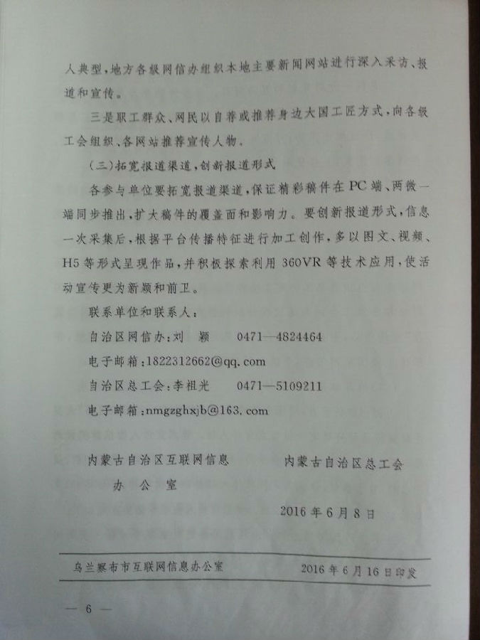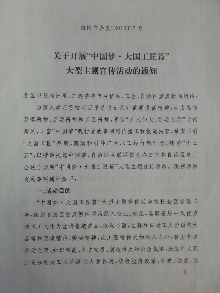 为发挥世界杯官网先进文化优势,展现世界杯官网广大教职工热爱祖国、热爱工作、热爱生活、蓬勃向上的精神风貌,落实乌兰察布市互联网信息办公室、乌兰察布市总工会《关于开展“中国梦·大国工匠篇”大型主题宣传活动的通知》精神,现将该通知转发,请参与者在9月15日前将作品报到行政楼506工会办公室。