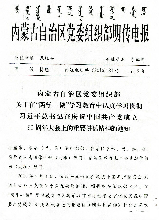 现将内蒙古自治区党委组织部《关于在“两学一做”学习教育中认真学习贯彻习近平总书记在庆祝中国共产党成立95周年大会上的重要讲话精神的通知》(内组电明字〔2016〕21号)转发给你们,请按照要求组织广大党员认真学习习近平总书记“七一”重要讲话精神,抓好贯彻落实。