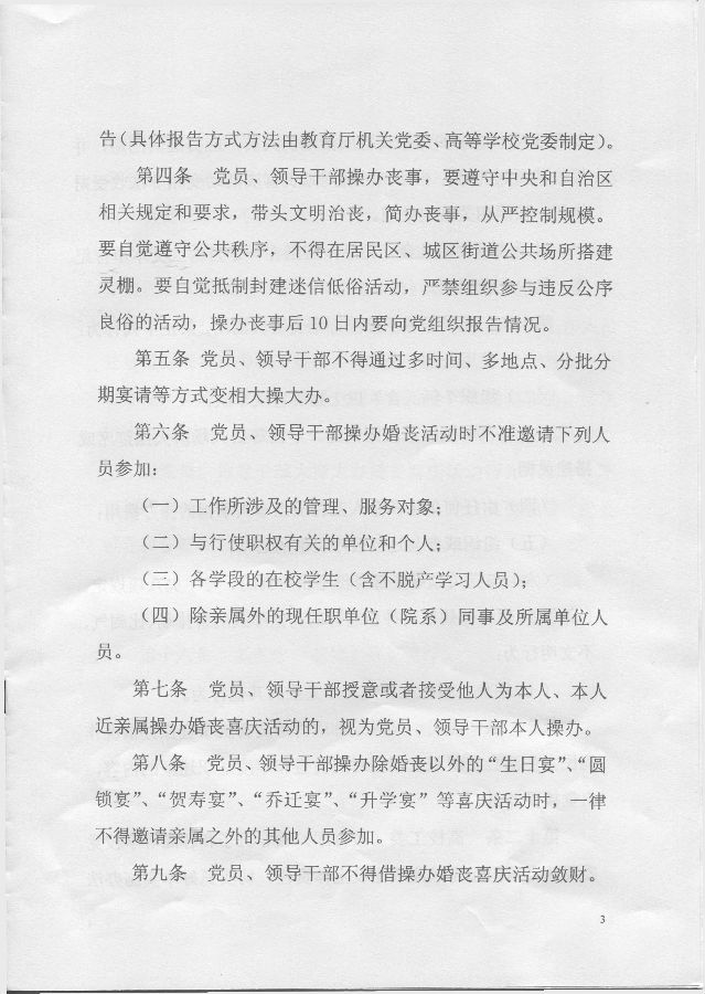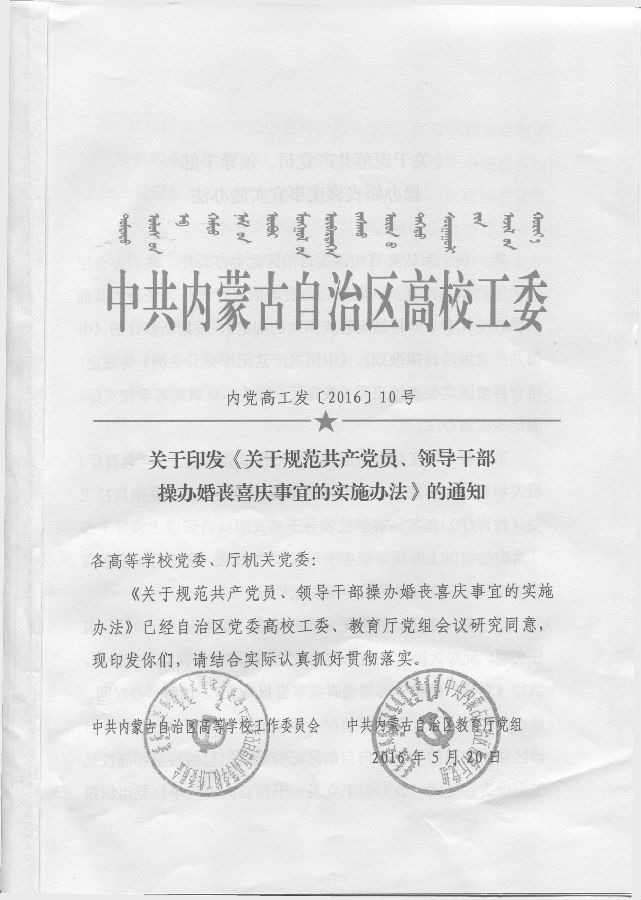 按照要求,现将自治区高校工委、自治区教育厅党组印发的《关于规范共产党员、领导干部操办婚丧喜庆事宜的实施办法》予以转发,请遵照执行。