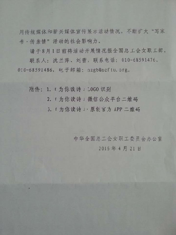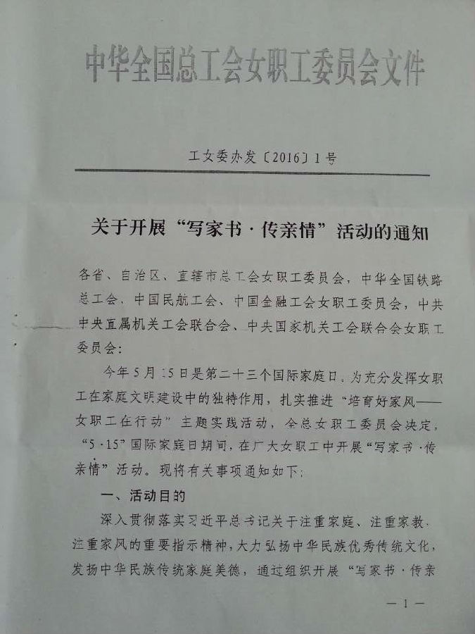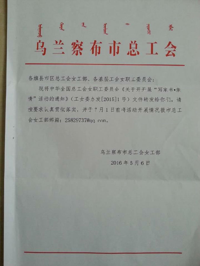 为落实中华全国总工会女职工委员会、乌兰察布市总工会女工部《关于开展写家书·传亲情活动的通知》精神,推进“培育好家风——女职工在行动”的主题实践活动,充分体现世界杯官网女教职工在家庭文明建设中的独特作用,现将该通知转发,请参与者在6月25日前将作品报到行政楼506工会办公室,联系人:李燕13847478557;王润梅13847424990。